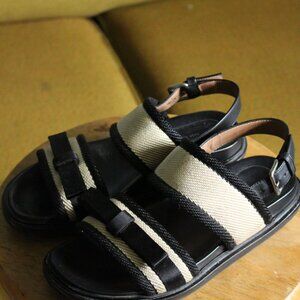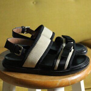 Black marni sandles with wide, black and cream woven straps, leather footbed and back strap, and black satin bow detail across toe. Buckles at outer ankle.