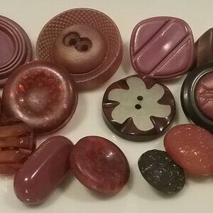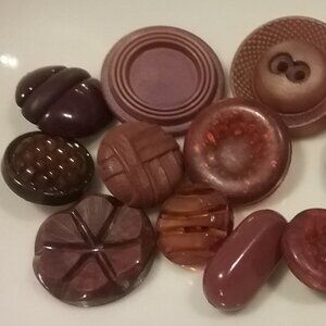 Here is a wonderful collection of vintage buttons, all in varying shades of red/browns/maroon. And, they are varying sizes and styles. Some are shank fastening and others are sew thru. The largest is 1 3/8 in diameter and the smallest is 3/4 inch in diameter. No two are the same.