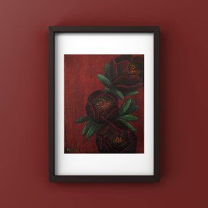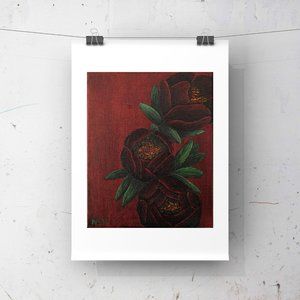Boldly colored "Maroon Peony" print. Print made on a high quality matte paper size 8 - 1/2" X 11'" Frame is not included. Actual artwork picture size is 6 - 1/8" x 7 - 5/8"