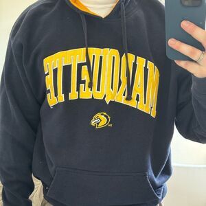 Navy blue varsity hoodie with yellow on the inside of the hood. It has a vintage look to it and the Marquette embroidery is neat.
