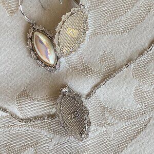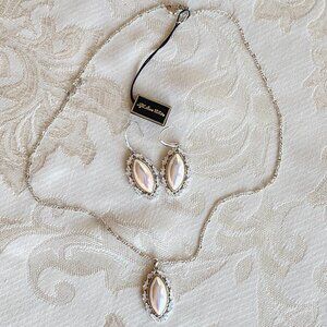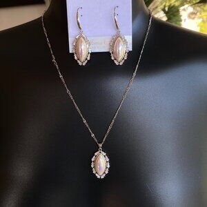 New with tag, Fifth Avenue Collection, Canadian Brand, Marquise Faux Pearl Opalescent CZ Necklace & Earrings set. A Striking Vintage appearance with Marquise shape Opalescent faux pearl cabochon & baguette cubic zirconia, silver tone rhodium plated, Sterling silver earring hooks. Necklace chain: 18", necklace pendant: 30mm L, /Earrings Length: 50mm. Nickel, lead & cadmium free, hypoallergenic.