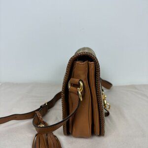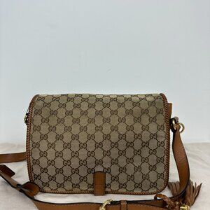 The flap features woven leather trims and the lined tassel with G detailing in gold-tone