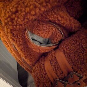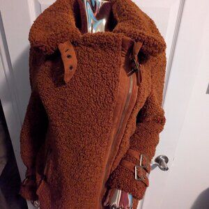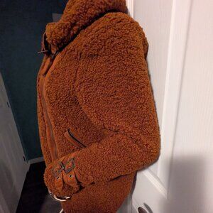 Aviator style. Size small. Pit: 48 cm. Sleeve length: 69 cm and total length: 67 cm. Stand-up collar with adjustable straps. The cuffs also have 2 adjustable straps. 1 zip pocket on each side. 100% polyester in a rich maroon color. Interior is 100% cotton in gray. Like new. Cozy.