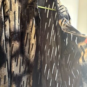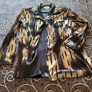 Add a touch of vintage glamour to your wardrobe with this Marsellis Collections blouse! This eye-catching top features a unique black and gold pattern on a soft, velvety fabric, perfect for making a statement.