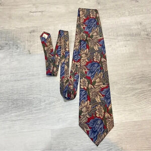 Damask floral printed tie in blue, tan, red and green made of 100% silk