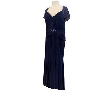 keywords: evening gown, beaded dress, formal wear, navy blue dress, elegant gown, beaded bolero, jewel waist accent, formal dress, pleated bodice, luxurious gown, women's evening wear, sophisticated dress, designer dress, mother of the bride, affordable designer formal dress, mermaid long dress, special occasion, flattering empire waist, long eve cocktail outfit.