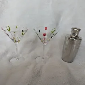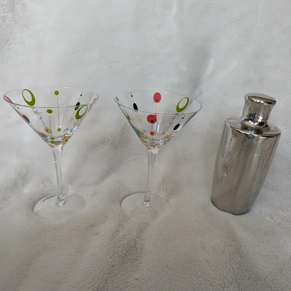 Set of 2 retro look crystal martini glasses and 3 piece cocktail shaker. Glasses have no cracks or chips.