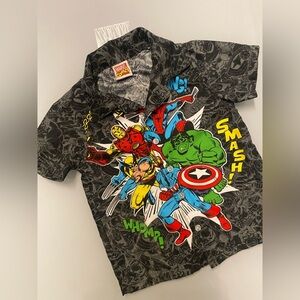 Dynamic Marvel shirt with Avengers in red, blue, green, and yellow. Features bold superhero graphics on black fabric. Size 2T