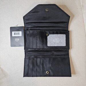 Black Panther metal logo, tri-fold with card slots and a zippered pouch.