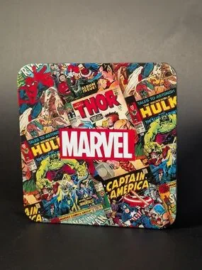 Bold Marvel comic collage print. Features iconic characters like Captain America and Hulk. Bright multicolor design with reds and blues. Eye-catching fan accessory. Great for everyday use.