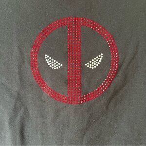 Marvel x Her Universe Deadpool cropped t-shirt in women’s size large. Classic black ringer tee with bold red trim and rhinestone-studded Deadpool logo on the front. Stretchy and soft cotton-spandex blend for a comfortable fit. Officially licensed Marvel merch sold by Hot Topic. Made in Mexico. Measurements included in photos.