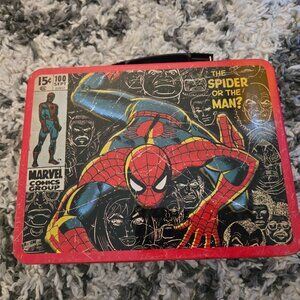This classic-style, tin tote/lunch box features a fantastic vintage Marvel comic book cover design on the front (including the 15¢ price stamp!) with a prominent, embossed (raised) image of Spider-Man and various villain/character faces surrounding him. The interior lid also features an embossed image.
