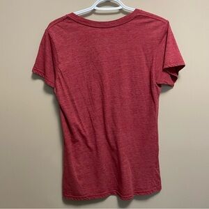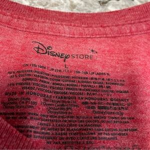 Red V-neck T-shirt featuring Marvel superheroes. Bold graphic design with iconic characters from the Disney Store.