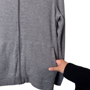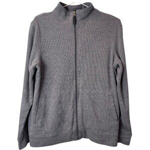 A Marvin Richards grey casual, full-zip sweater jacket, likely designed for warmth and comfort. The jacket has ribbed knit texture, made from cotton blend. It features a stand-up collar and front pockets, providing both a classic and functional look. The ribbed cuffs and hem further enhance its comfortable and classic appeal.