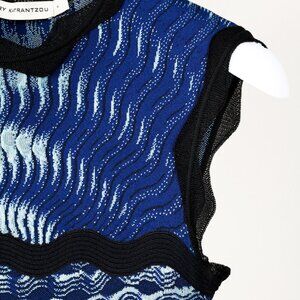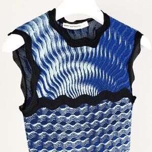 Perfectly encapsulating the designer's passion for intricate needlepoint, the Swisher dress from Mary Katrantzou's 2016 Pre-Fall collection is crafted in a wavy Blue knit, and is contrasted with wavy black ribbing throughout. It features a sleeveless design, a crew neck, a knee-length pencil-cut skirt, and scalloped edges on the armholes and neck.
