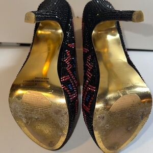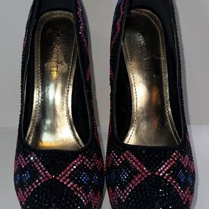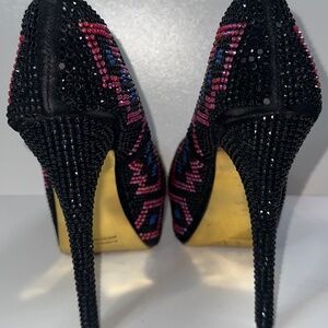 Black jewelled platforms with Neon pink and blue jewelled designs, gently used, some wear on soles.