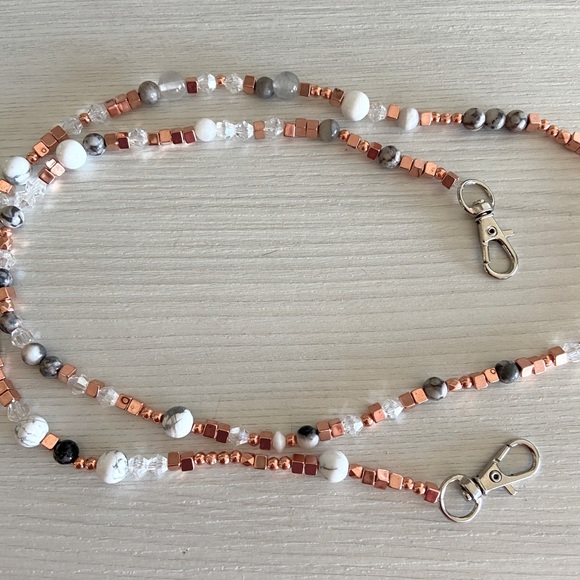 Rose gold toned necklace with white howlitt stones. Attach to any mask. Grab and go! Never lose your mask again.
