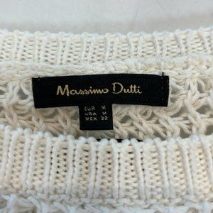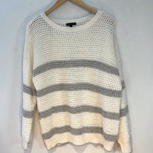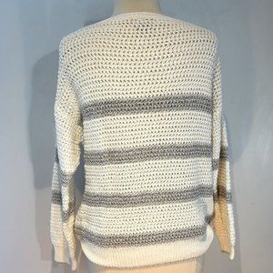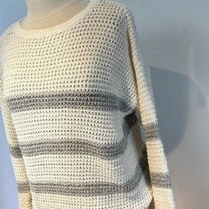 Chic knit sweater with a scoop neck. Features cream and gray stripes. Ideal for everyday style.