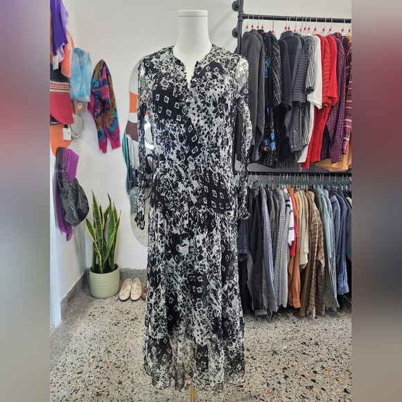 Embrace a chic bohemian style with this Massimo Dutti long dress, size M, in airy silk with a black and white floral print. Its waist-cinched cut and front buttons highlight the silhouette, while the semi-sheer sleeves and lined body provide comfort and elegance. Stretch fabric ensures a comfortable fit. 📐 Waist: 12" | Shoulder: 15" | Pit to pit: 15" | Sleeve: 21" | Total length: 43". A feminine and sophisticated piece for special occasions.