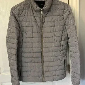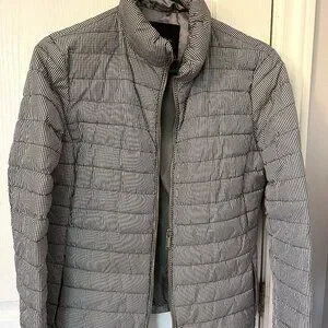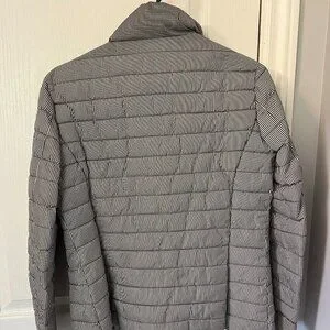 Fitted Lightweight Puffer Style Zip front Jacket. Black and White Gingham Plaid Check Pattern.