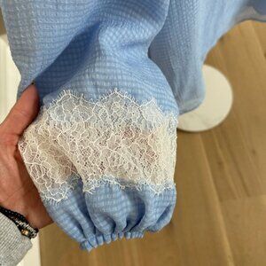 Timeless and feminine, this Massimo Dutti gingham blouse blends classic tailoring with delicate details. Featuring a black-and-white gingham pattern and lace trim at the neckline and sleeves, it offers a refined, versatile look that transitions seamlessly from office wear to brunch to evening outings.