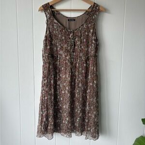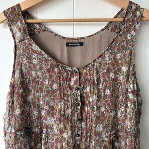 Chic floral midi dress with a sleeveless design. Features a blend of earthy tones with beautiful ornate buttons.