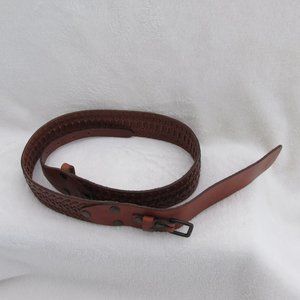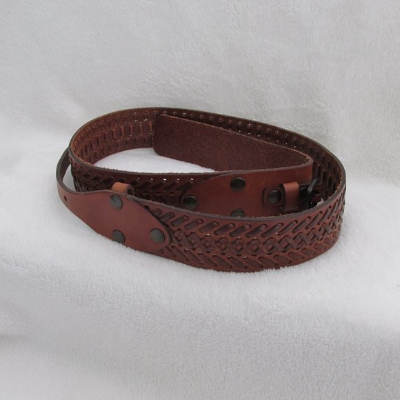 Massimo Dutti wide brown woven design cow leather belt with solid brass buckle and studs, single leather keeper loop, and 5 holes.