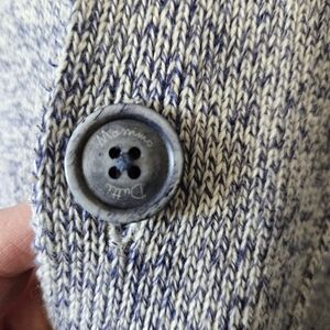 Amazing Massimo Dutti wool and cashmere sweater. A navy and white knit with a sky blue zippered lining that goes up the neck. The sweater has a buttoned closure with two front pockets.