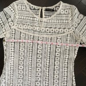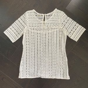 Beautiful sheer lace short sleeved tee with back neck button closure