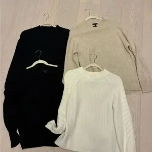 Three knit sweaters. Classic crew and textured styles. Versatile neutral colors. Easy to mix and layer.