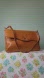 Retro convertible clutch bag. Tan outer with brown lining. Envelope clutch style with removable strap. Can be clipped as a wristlet strap or clipped through eyelets on the top of the bag.