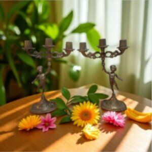 Matching Pair of Vintage Brass Cherub Candelabras - Candlestick Holders