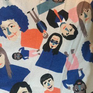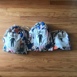 Set of matching family pajamas - onesies - from The Drake General Store in Toronto. Three pairs: adult size M, adult size S, and baby size 6-12 months. Cotton and polyester blend waffle weave. Good condition. Theme is Canadian celebrities, including Drake, Margaret Atwood, Joni Mitchell, Geddy Lee. Carrying pouch for each size.