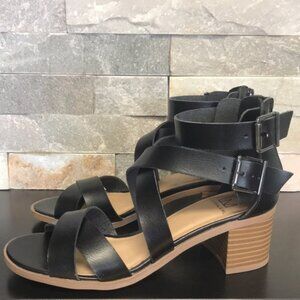 Stylish 2 inch heel black strappy sandals with back zipper closure.