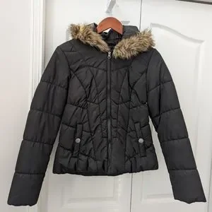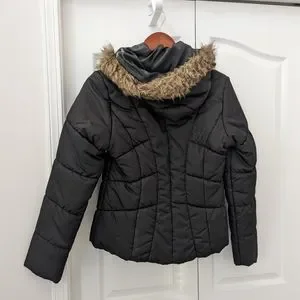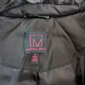 Material Girl jacket in medium. Black, hooded jacket with faux fur on trim of hood. New condition.