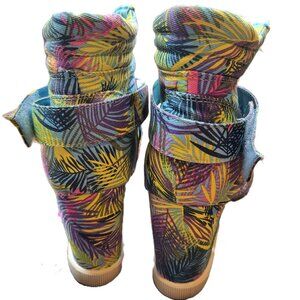 Material Girl brand high-top wedge sneakers with a vibrant, colorful tropical leaf pattern.
