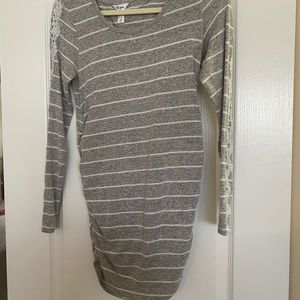 Long maternity sweater with lace detail up both arms. Very cute with leggings. Can be dressed up or down.
