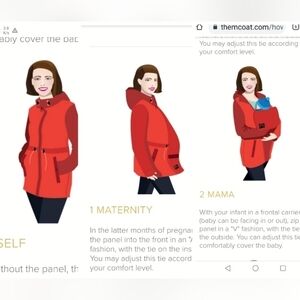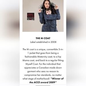The M coat is a convertible down Winter coat. This is an everything coat. Trench coat, Maternity coat and for Baby wearing! SZ XL Search "themcoat" for retailers and more details if you want to try in on. Bought at bellies in bloom early in pregnancy. Worn once! Tag is in the pocket for lifetime warranty.
