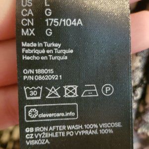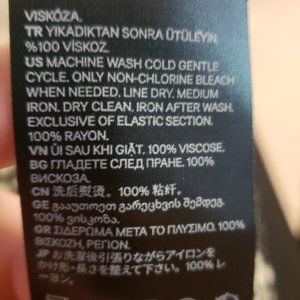 V neck with side wrap tie under bust, lands at the knee. Very flattering and comfortable.