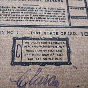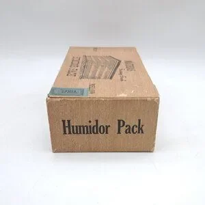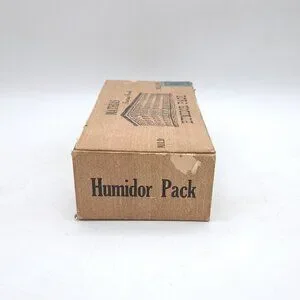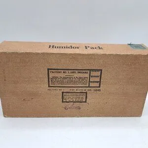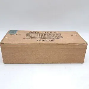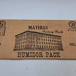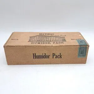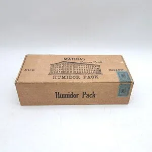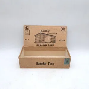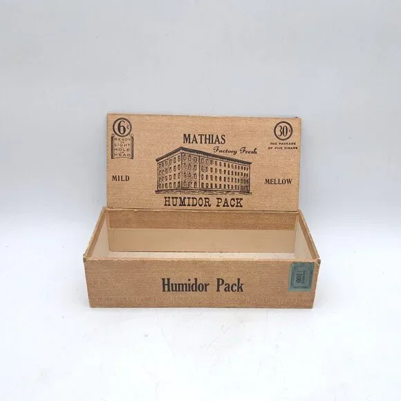 An empty carton cigar box -labelled a humidor pack- of Mathias Factory Fresh cigars. I am unsure of its age but it comes from a time where a cigar could cost 6 cents. It is rare as I couldn't find another box anywhere on the web nor a mention of Mathias cigars. The box was meant to be on the counter of a drug or cigar store; the lid would be flipped open and would display the prices, 6 cents for 1 or 30 cents for a pack of five. The lid has become detached and there is wear as in the pictures.