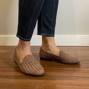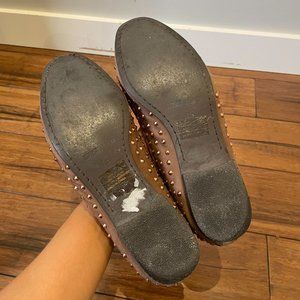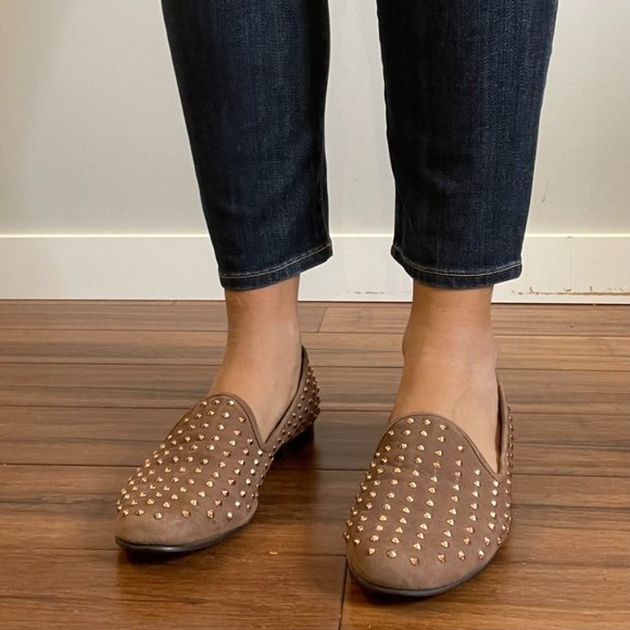 Sassy tan loafer with rose gold studs in size 7.5. May fit up to an 8. Insoles recommended to add cushion to footbed. Broken in.
