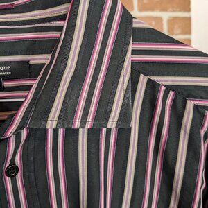 Good used condition. Black shirt with pink, taupe and purple stripes. Slight fading on collar edge as shown in photo.