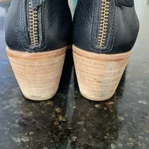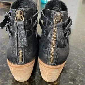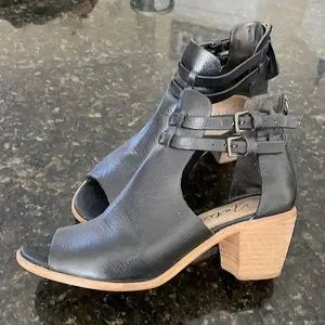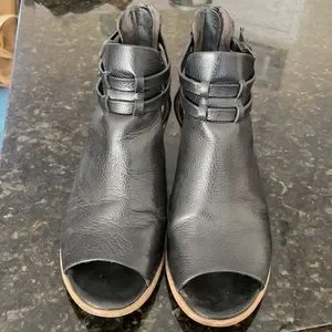 Beautiful black leather open toe and open side booties Straps on ankles are adjustable and they zip up the back Lightly worn condition Heel is 2.5”