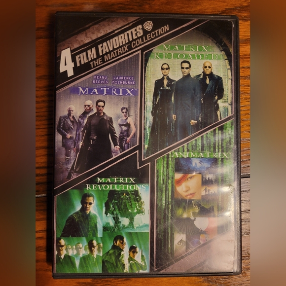 4 Film Favorites: The Matrix Collection DVD set. Includes Matrix, Matrix Reloaded, Matrix Revolutions, and Animatrix. Perfect for sci-fi fans.