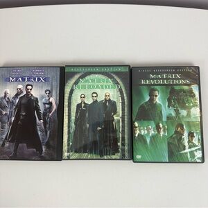 Complete Matrix Trilogy DVD set. Includes Matrix, Matrix Reloaded, and Matrix Revolutions. Perfect for sci-fi fans.