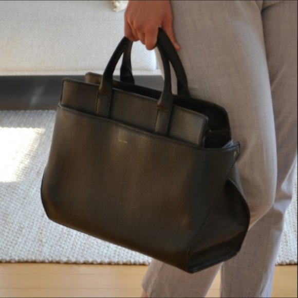 Satchel with adjustable and removable crossbody strap. Top zipper closure. Large pocket along front with hidden magnetic closure. Fits 13" laptop. Interior: 13" laptop padded compartment, zipper pocket, smartphone pocket, logo-embossed Dwell tag. 100% recycled nylon lining. Dimensions: 16" x 11.5" x 5" Shoulder Strap Drop: 19" - 23" (adjustable) Handle Drop: 4.5"