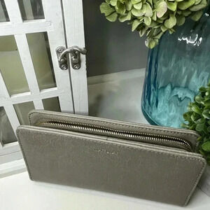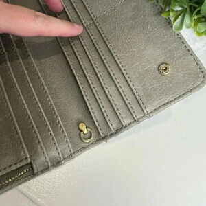 New condition, just missing a small strap that hooks inside (see photo). Snap closure. Interior: zipper closure coin pocket, 14 card slots and 2 bill compartments. Cement gray.