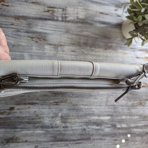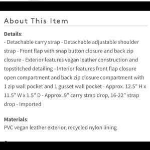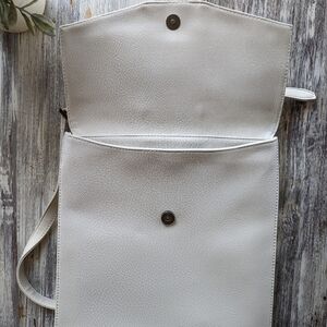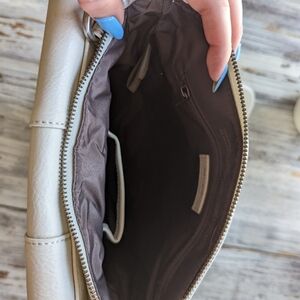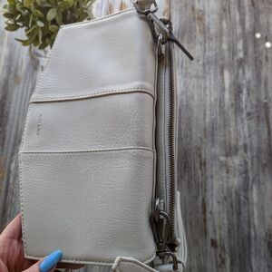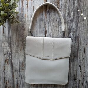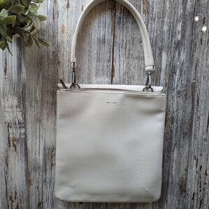 Vegan leather bag with hand and shoulder straps in an off white/cream color.