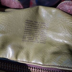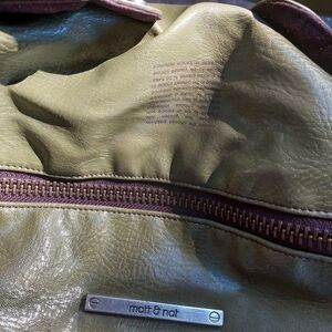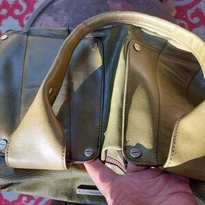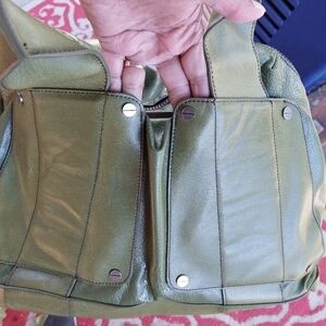 Large olive green non-leather bag. Features double outside pouches on front and back. Heavy duty straps. approx 7.5" from center. Large zipper closure. Inside clip for keys.