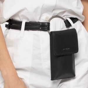 The belt has a metal ring detail and a removable cell phone pouch that can be attached to the ring or the belt strap